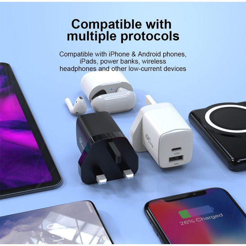 • Dual Charging Ports: Equipped with both USB-C and USB-A ports, the charger offers flexibility to charge multiple devices at once.​