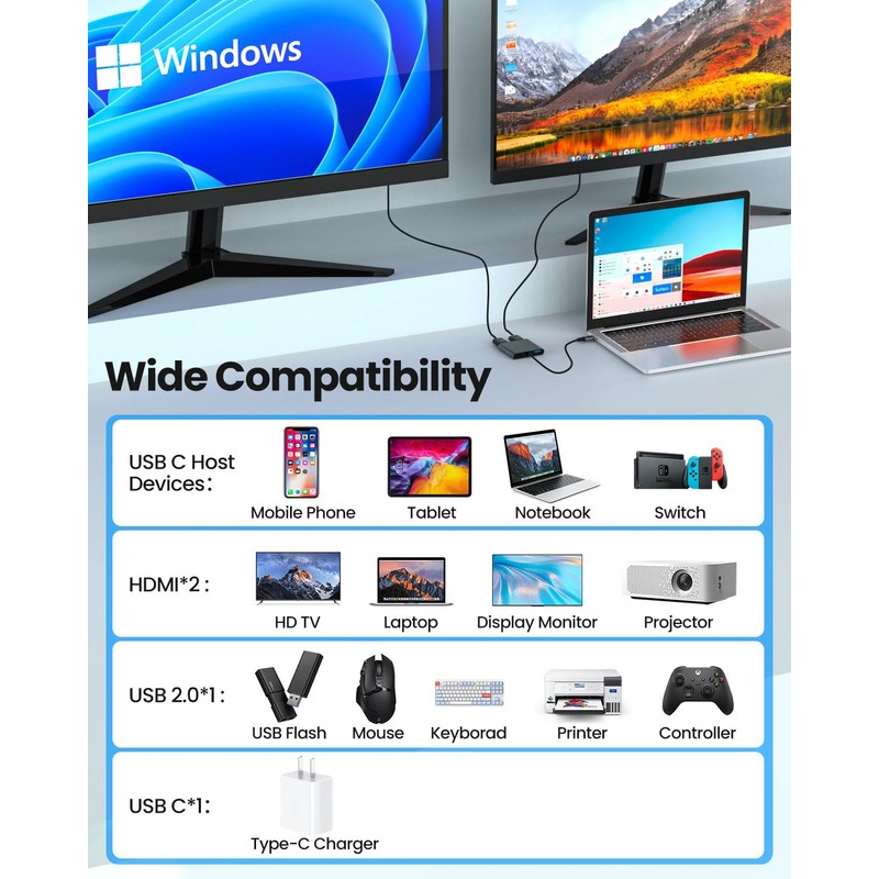 - Wide Compatibility: The HDMI splitter for dual monitors is plug-and-play compatible with a wide range of USB-C devices, including MacBook Pro, MacBook Air, iMac, iMac Pro, Mac Mini, iPad Pro (2020/2019/2018), iPhone 16/15/Pro Max, Chromebook, Dell, HP, and many other smartphones, laptops, and tablets
