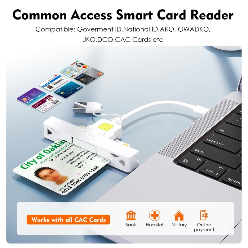 - Multifunctional CAC reader for military and authorities: Our professional Type-C and USB-A smart card reader has been specially developed for reading CAC cards, government ID cards and ID cards, making it the perfect solution for military and regulatory applications. It supports various chip cards, including 5V, 3V and 1.8V chip cards. Perfectly compatible with ID cards from Belgium, Spain, Italy, France, Portugal and Germany.