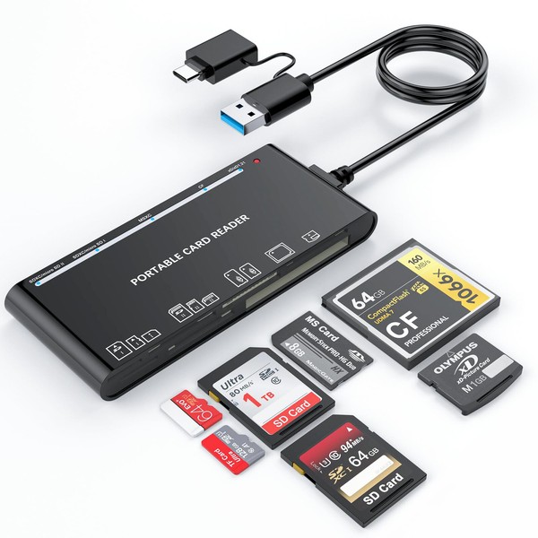 USB 3.0 Multi SD Card Reader with USB C Adapter 7 in 2 Memory Card Reader/Adapter/Hub for SD SDXC SDHC CF CFI TF XD Micro SD Micro SDXC Micro SDHC MS MMC UHS-I Cards for Windows/Mac/Linux/Android