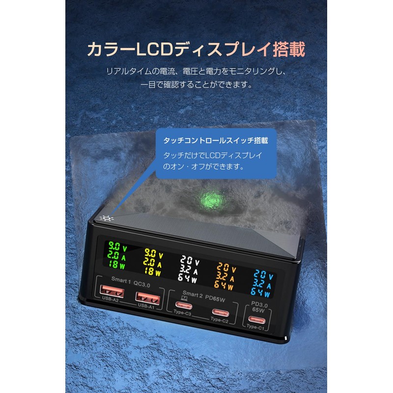 USB Charger, Total 180 W, PD Charger, LCD Display, PD65W Rapid Charging, 2 Laptops Simultaneously, Supports PD 3.0, PPS, QC4+, 5 Ports, USB-C x 3 & USB-A x 2, Laptop Charger, Smartphone Charger, PSE