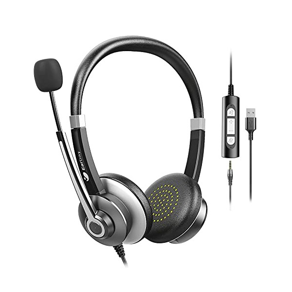 USB Headset with Microphone for PC, Computer Headset with Microphone Noise Cancelling for Laptop, 3.5mm Jack On-Ear Wired Headphones with Mic, Volume Control for Call Center/Skype/Zoom/Webinar