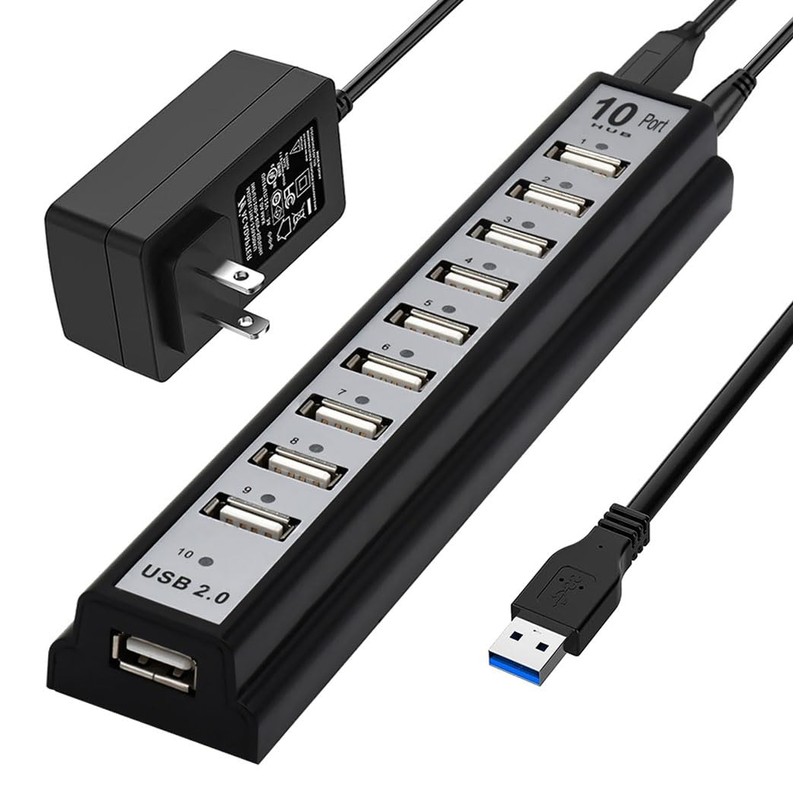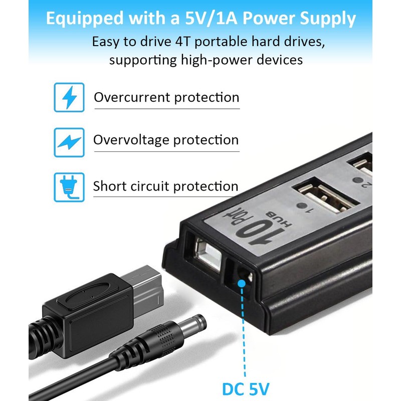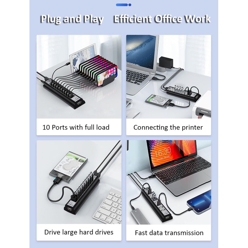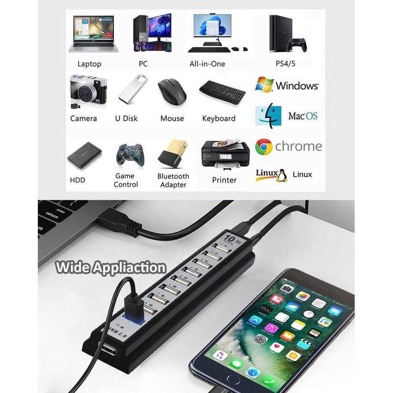 - 【USB hub 10 port Function】Can expand one USB interface into 10 independent USB interfaces. Supports USB2.0 compatibility with USB1.0/1.1, with a speed of up to 480Mbps, and each USB interface can power up to 500MA. With a power supply, it can drive high-power USB devices and connect to 500G portable hard drives.