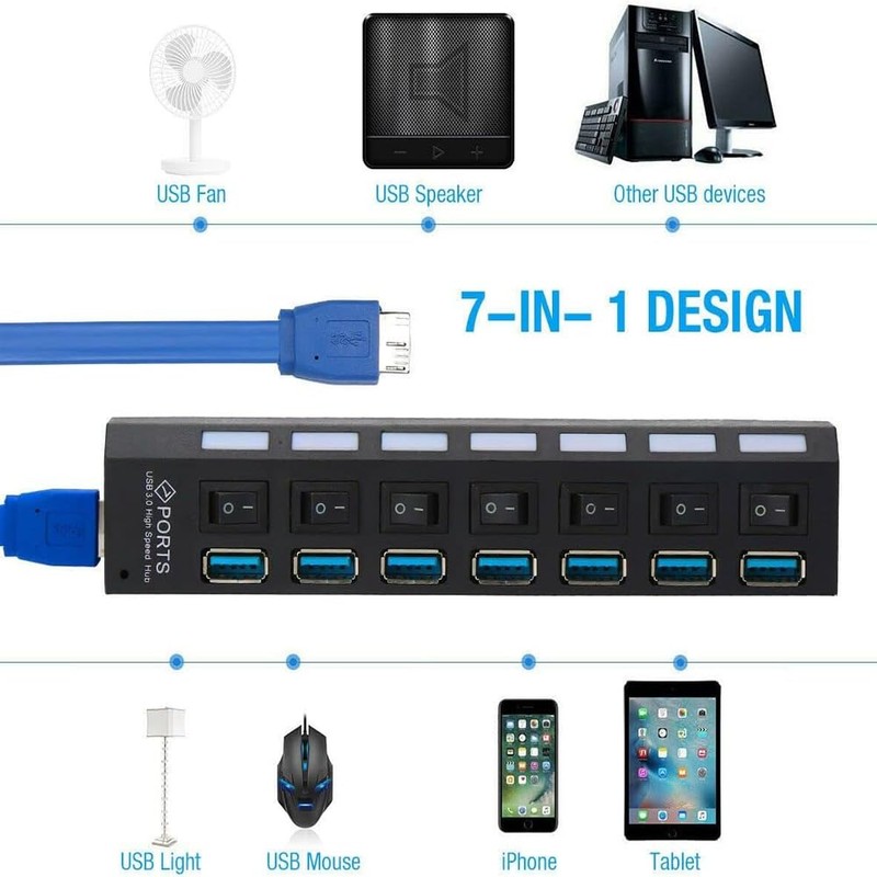 USB HUB,7 Port USB 3.0 HUB 5.0Gbps Data Transfer, with Independent LED Power Switch for XPS, PC, Flash Drives, Portable Hard Drives, etc.,