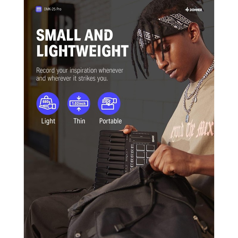 USB MIDI Keyboard Controller, 25 Key Portable MIDI with 8 Backlit Drum, OLED Screen Display for PC/MAC, Music Production Software Included, Donner DMK25 Pros with 40 Free Courses, Black