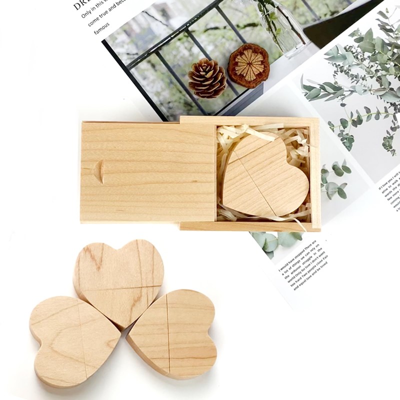 - Ideal wedding gift - Classic and elegant heart-shaped USB stick and box set made of wood made of maple wood. Logo, design or blessing can be engraved on the smooth surface of the memory stick or box. Ideal as a birthday or wedding anniversary gift or as a gift from the photographer to a customer. This will be a unique and impressive surprise