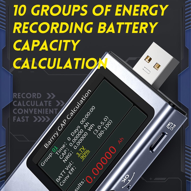 The USB tester displays up to six digits of voltage, current and power with a maximum resolution of 0.00001 (V/A/W). Switchable between 10 sets of capacity, power and time.