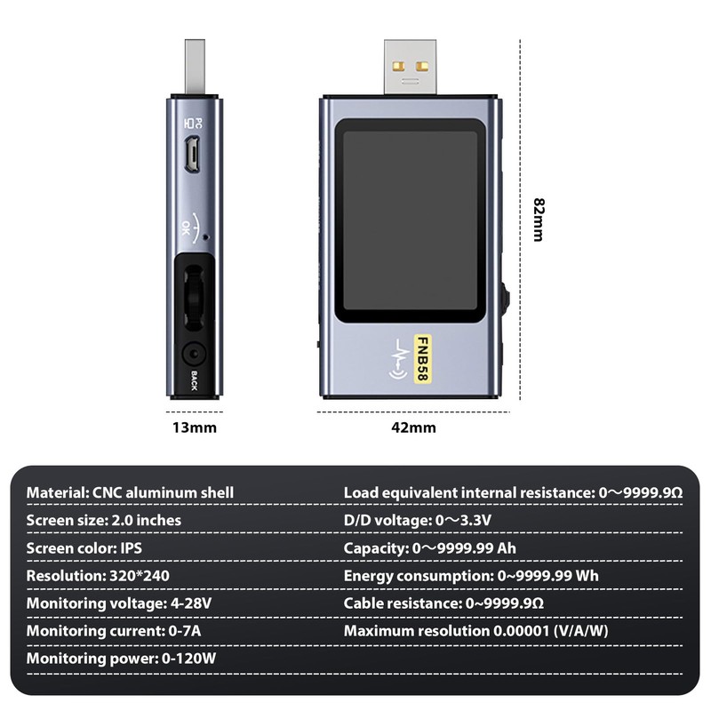- Multifunctional Digital USB Tester - FNB58 uses an external 16-bit ADC, a physical chip with PD protocol. The USB tester FNB58 can monitor voltage, current, power, resistance, capacity, D+/D voltage, etc.