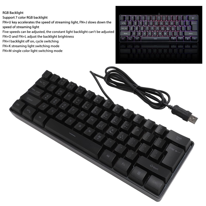 1、Compact Design: This 60% gaming keyboard is perfectly sized for all environments, business travel, office, home use, no need for numeric keypad, more practical for gamers and typists, more space for your desktop. 2、Ergonomic And Mechanical Feeling: Gaming keyboard key height is designed according to ergonomics, not easy to fatigue after long time use. Advanced mechanical imitation technology to enhance the using experience. 3、RGB Backlight: Support 7 color RGB backlight, FN plus U key streaming light speed accelerated, FN plus J streaming light speed slowed down, five speeds can be adjusted, the constant light backlight can not be adjusted. 4、Backlight Adjustment: FN plus O and FN plus L adjust backlight brightness, FN plus I backlight off on, cycle switching. FN plus K streaming light switching mode, FN plus M single color light switching mode. 5、System Support: This keyboard is suitable for Windows 2000 XP ME 7 8 10 and other operating systems. Suitable for PC gamers, typists, easy to carry, suitable for traveling, business trips, etc. 6、Durable And Reliable: USB wired keyboard is designed with ABS keycaps, the letters will never fade. Premium ABS material, durable. No driver required, direct plug and play, responsive.
