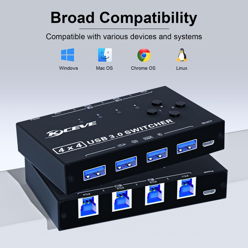 - 【USB3.0 Switch】This USB switch allows users to control 4 computers to share 4 USB3.0 peripheral devices together, such as keyboard, mouse, printer, scanner, USB flash drive, etc. No more need to prepare multiple USB devices or change locations repeatedly, making life simpler and tidier!