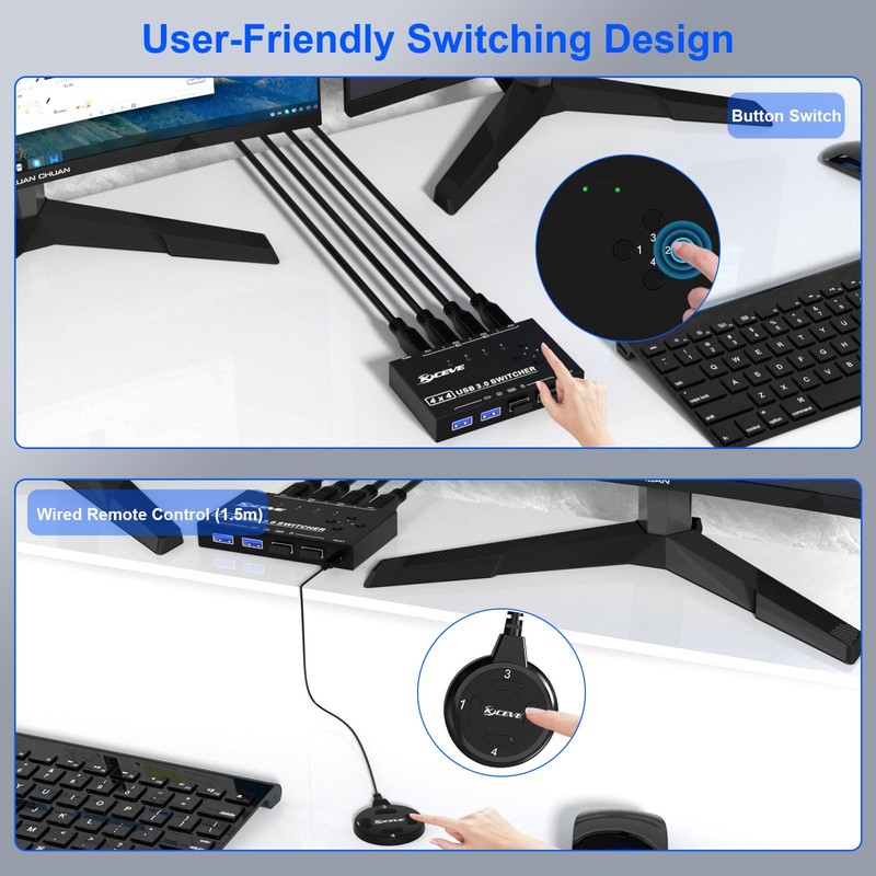 - 【User-Friendly Switching Design】Push-button switching and wired remote control switching available. Use the 1.5m remote control, you can hide the switch anywhere and keep the remote control handy. No more dealing with cluttered desktops, making desktop tidier and switching easier!