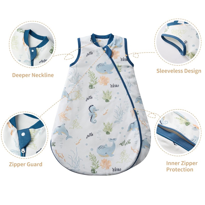 - Large Space: The hem of the sleeveless baby sleeping bag has been scientifically widened, providing sufficient free movement space for the baby's hip and leg to ensure normal development. The neck and arm openings are precisely tailored to provide a snug fit;