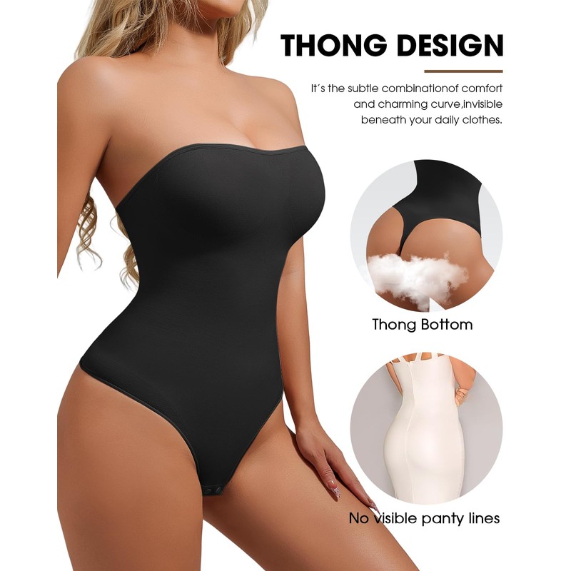 - 【Open Crotch & Thong Design】The snap closure at the crotch of this body shaper for strapless dress makes it convenient for bathroom. This seamless strapless shapewear features high leg openings, thong back and seamless design, making the pantie line invisible under your clothes