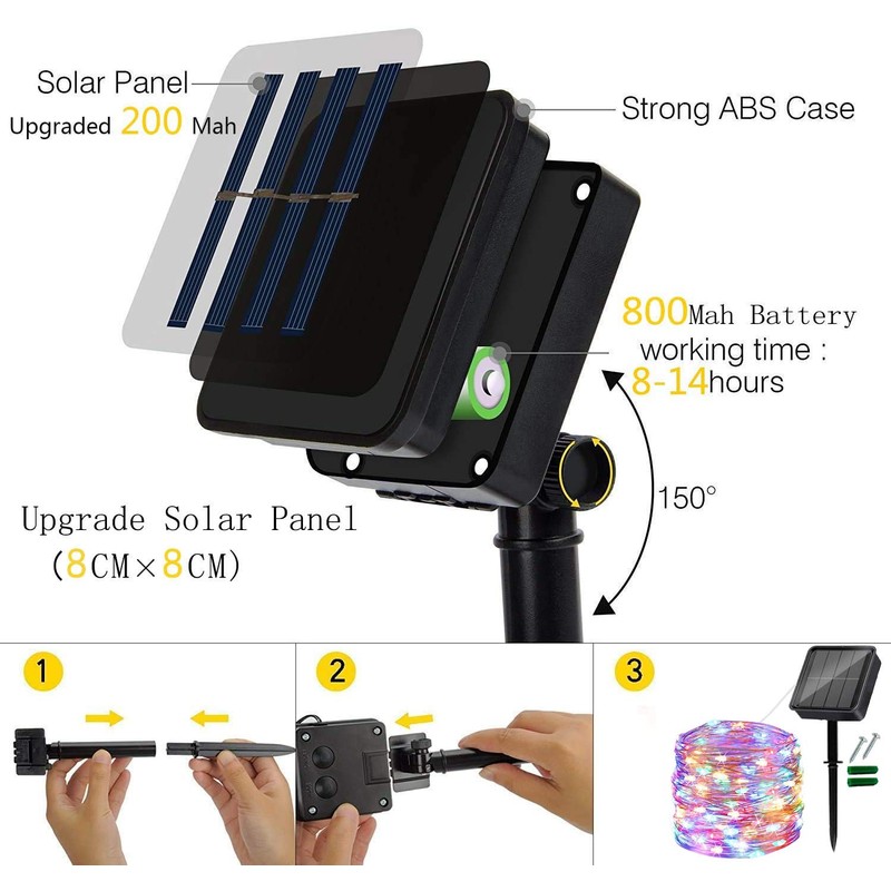 - ??Wasserdicht und LeichtIP65 wasserdichte, flexible Lichterkette l?sst sich leicht wickeln und biegen. Laden Sie tagsber 6-8 Stunden lang auf und sorgen Sie nachts fr 8-14 Stunden Beleuchtung.