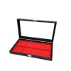 Pocket watches key locking black grained leatherette glass top display case with red 8 space insert.