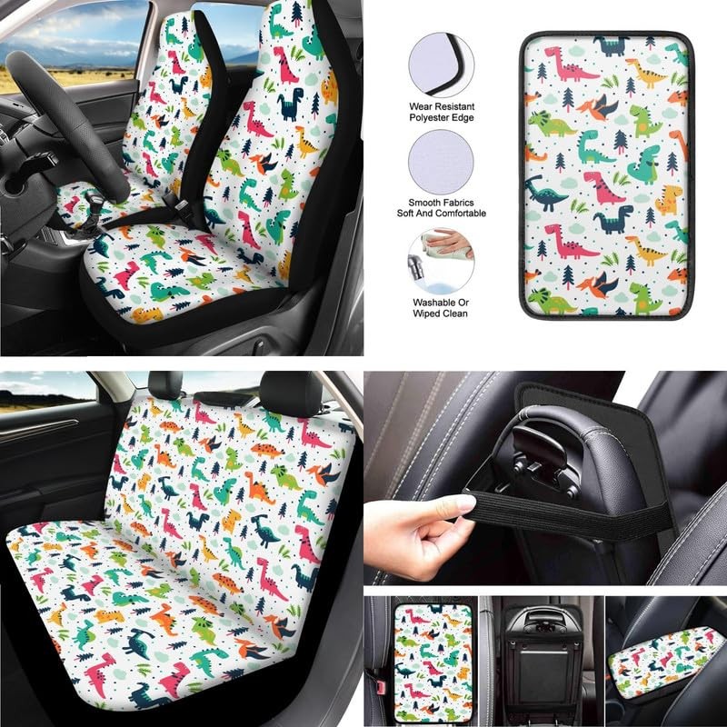 Uskorhein Cartoon Mini Dinosaur T-rex Hand Drawing Car Seat Cover Full Set Universal 13 Pcs for Cute Pterosaur Dinosaur Forest Front and Back Seat Cover Keychains for Truck SUV…