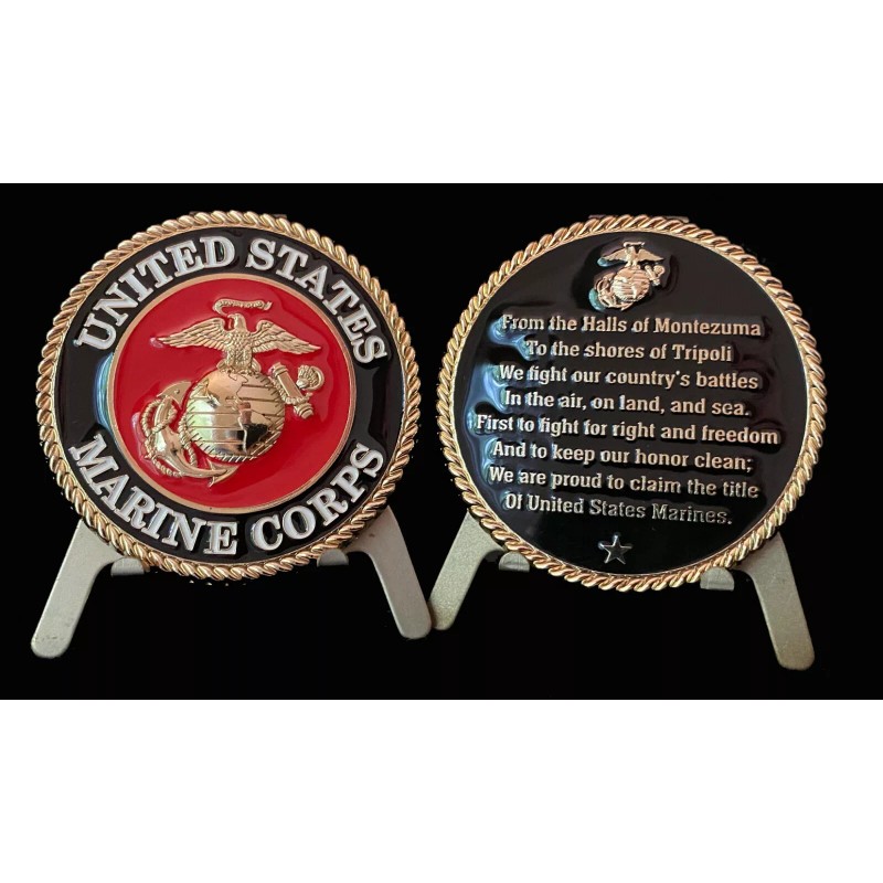 USMC MARINE CORPS CHALLENGE COIN MARINE HYMN ON REVERSE GOLD VERY NICE 2.2"