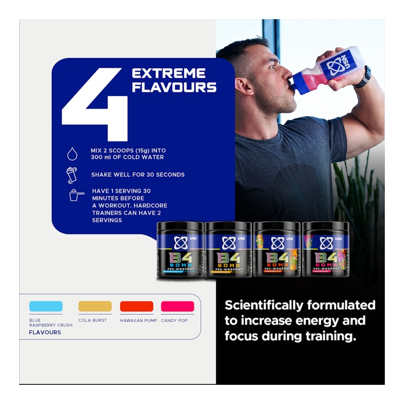 - Experience explosive energy and RawPower™ with USN B4 Bomb pre workout. Challenge yourself to unlock ultimate performance with our award winning pre-workout. Scientifically formulated to increase your energy and focus during training.