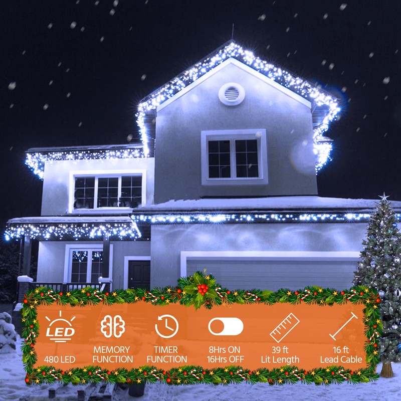 USOKYO Icicle Christmas Lights Outdoor, 480 LED 39FT String Lights With 96 Drops, 8 Modes and Timer, Twinkle Fairy Lights for House Patio Bedroom Wedding (Cool White)