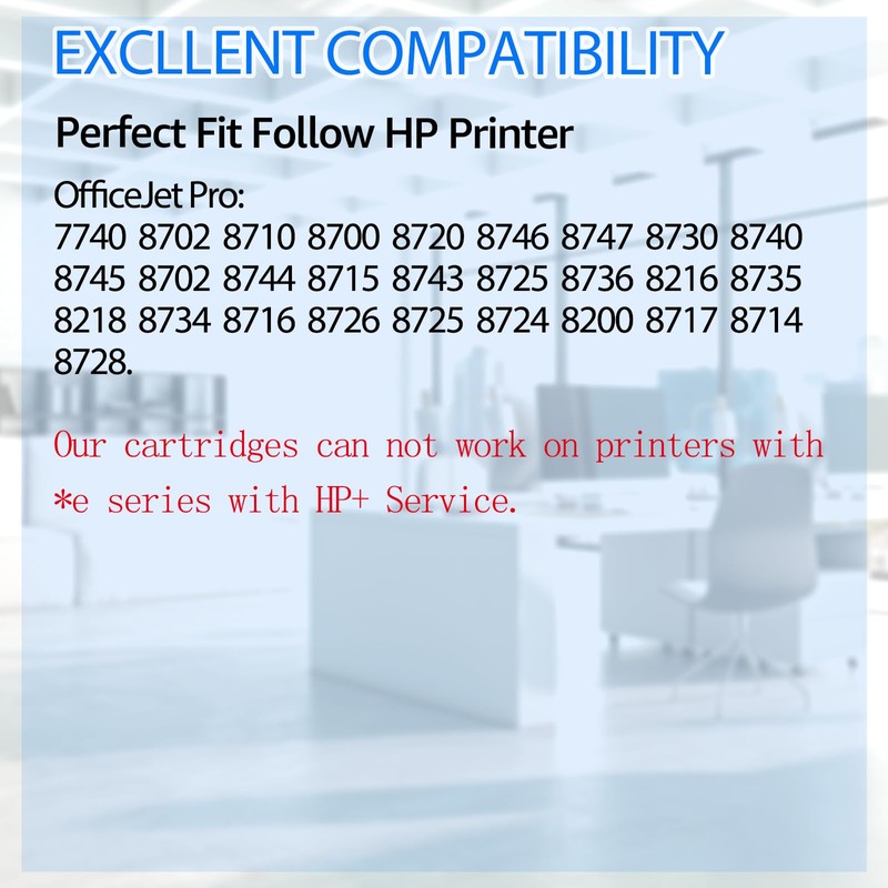 - Compatible for HP Printer: OfficeJet Pro 7740,8702,8710,8700,8720,8746,8747,8730,8740,8745,8702,8744,8715,8743,8725,8736,8216,8735,8218,8734,8716,8726,8725,8724,8200,8717,8714,8728. TIPS: Our cartridges can not work on printers with *e series with HP+ Service!!