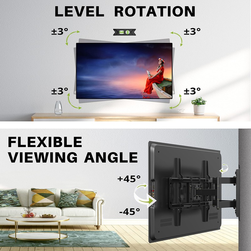 This tilting TV wall mount bracket fits most 32-90”TVs up to 150 LBS, with VESA size available VESA 200x100mm to 600x400mm(Available VESA Patterns: 200*100mm, 200*200mm,400*200mm, 400*400mm, 600*400mm). This TV bracket with dual articulating arms includes +5° /-15° tilt, ±45°swivel( maximum swivel angle depends on your TV), +/-3°post-installation adjustment allows the perfect TV leveling. You can pull out this full motion tv wall bracket to 19.09” and retract back to 3.35”, it will save some valuable space for you and make your house look neat.