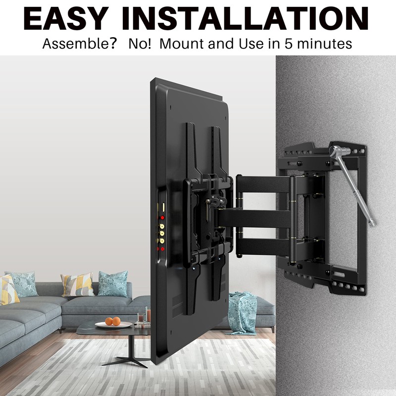 - Full Motion Adjustable: The swivel tv wall mount can be tilted +5°/-15°and swivesled +/-45°for more comfortable viewing experience. You can pull out the tv mount bracket to 19.0" and retract back to 3.35", which save some valuable space for you.