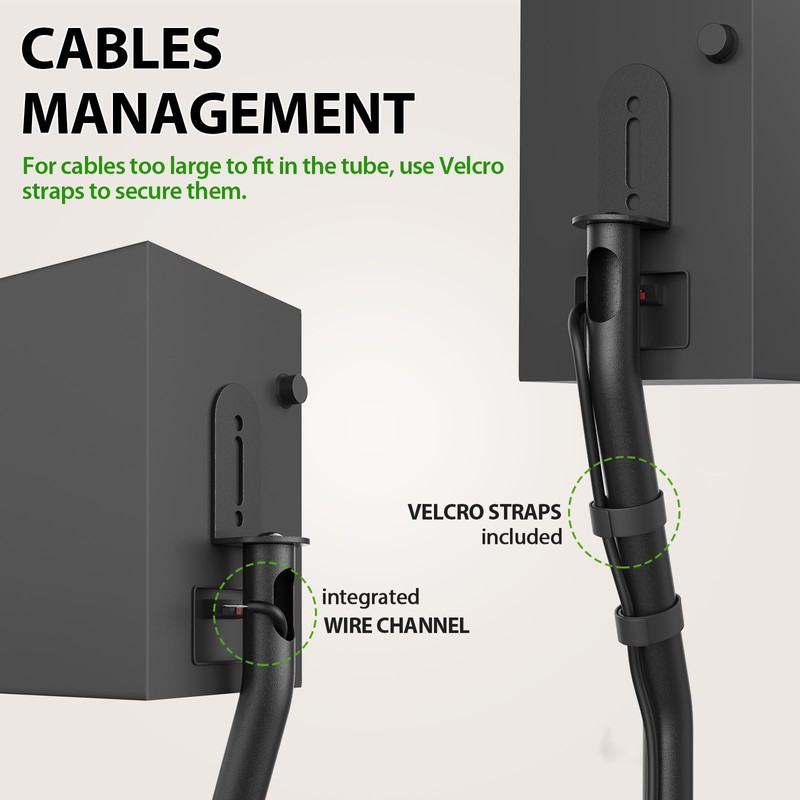 - CABLE MANAGEMENT:The floor speaker stands keep cables clean and organized with internal channel ( 0.6“ W x 1.2” H) for a clean and tidy appearance. Or external velcros in package to help run the cable around the stand tube.