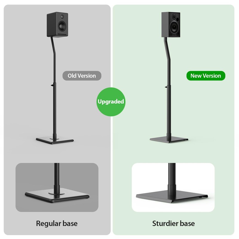 - STURDY SQUARE BASE:The floor speaker stands is constructed from high quality steel materials which is sturdy enough and durable. The square base of the rear speaker stands is more stable and the weight capacity up to 11lbs/5kg per stand. No worries about it tipping over. Rubber feet for wooden, cement, tile or other hard floor. If the stand is placed on carpet, install the carpet nail.