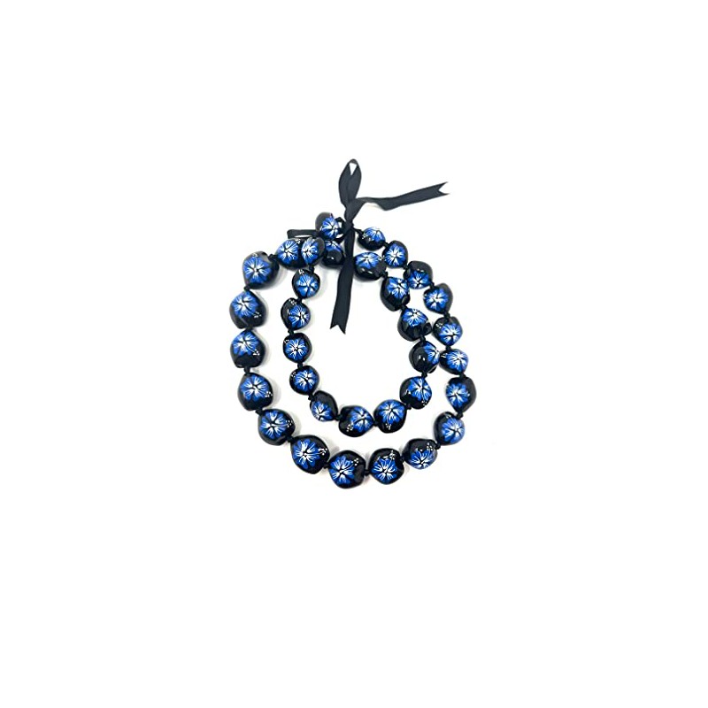 Utama Hawaiian Kukui Nut Leis Beads Necklaces with Hand Painted Flower- Blue Flower
