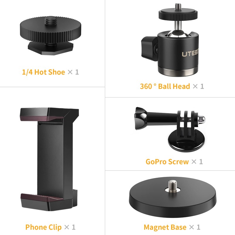 - [Universal] The mounting scew and thread of the magnetic base, ball head, hot shoe, action camera adapter and phone holder are all 1/4, suitable for most photographic equipment. The set can not only fix the equipments for you, but also can be used with other photographic equipments to reduce the burden and easily record beautiful moments.