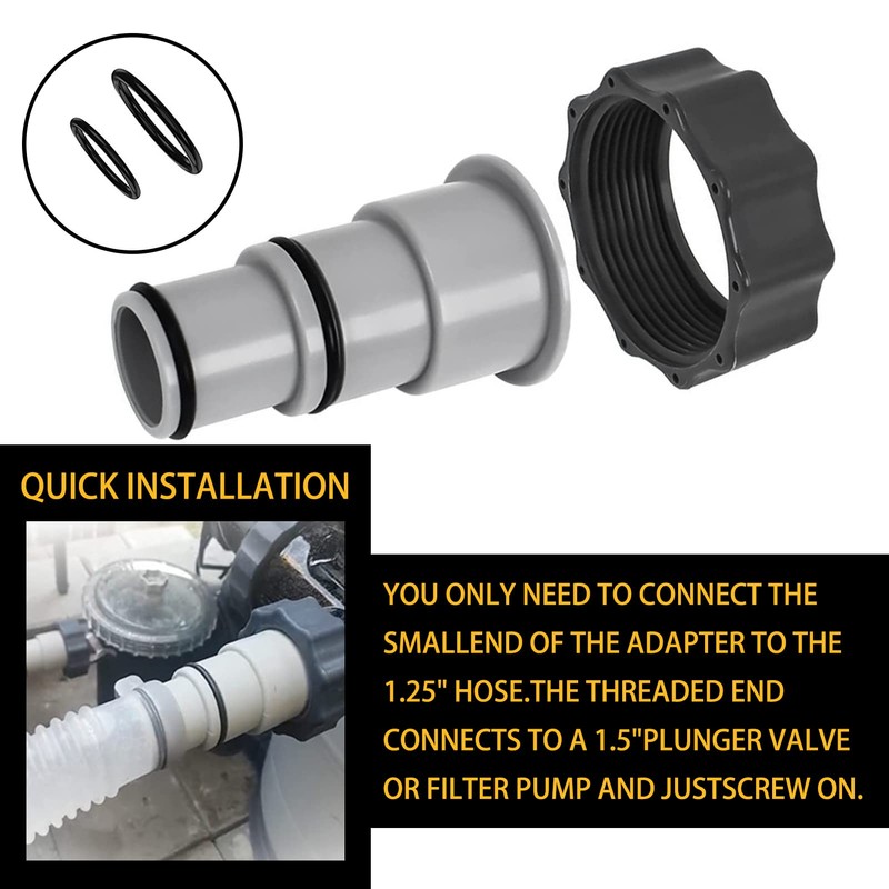 - Easy to install pool hose adaptor: the small end is connected to the 1.25 inch hose. The threaded end connects to a 1.5 inch piston valve or filter pump. Simply screw on. No need to buy additional hoses and avoid additional costs.