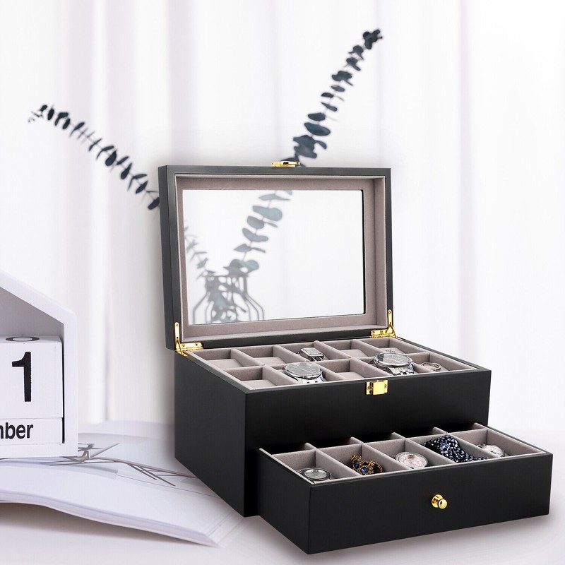 In the top layer of the jewelry case, there are 10 watch slots with removable velvet pillows. And in the bottom layer, there are also 10 watch slots adequate suitable area for your cufflinks, necklaces, bracelets, earring, brooches,sun glasses and any other jewelry and belongings.