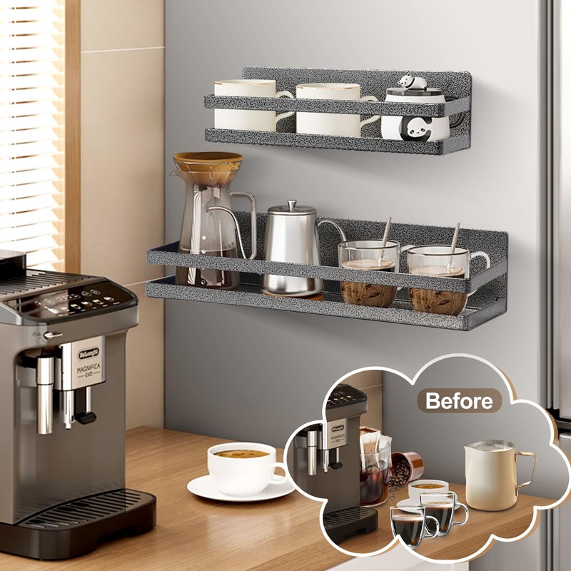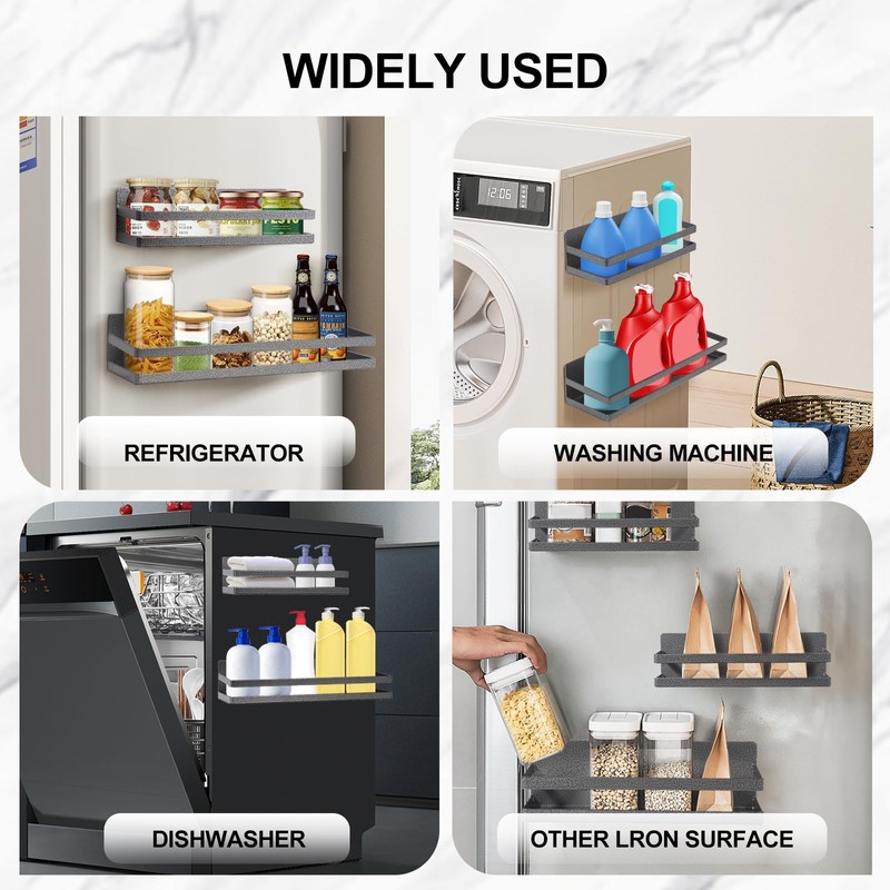 - 【2 Large Spice Racks & Multiple Uses】The two magnetic shelves included are of different lengths, extra large shelf: 15.7*4.33*3.5 inches, large shelf: 11.8*3.9*3.5 inches, larger than the size of other similar shelves. Extra Large 2-piece magnetic spice rack fits on the side of your fridge, microwave, washer, dryer, coffee maker and any other iron product, giving you a place to store all your kitchen gadgets