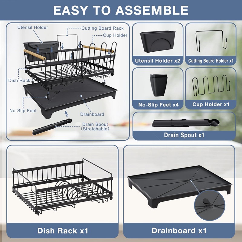 • Easy to Assemble & Space-Saving: Our kitchen dishes organizer is packed with dish rack, drainboard, utensil holder, cutting board rack, cup holder and retractable drainpipe. Only took few minutes to get it all put together, no extra tools needed. This dish rack for kitchen counter is small in size, which can perfectly save space on your kitchen countertop.