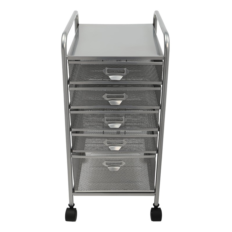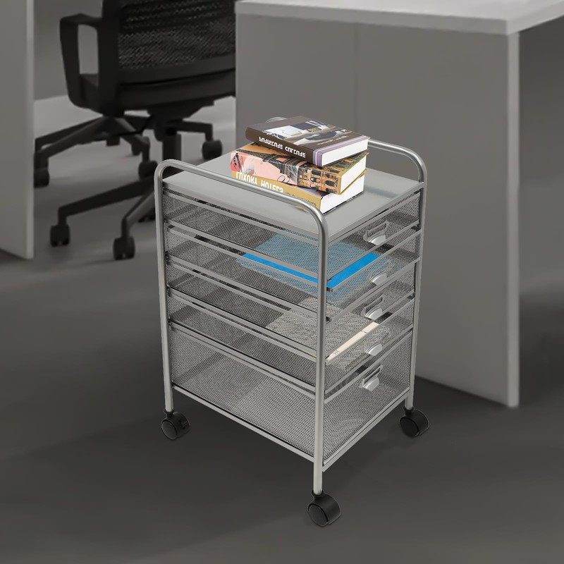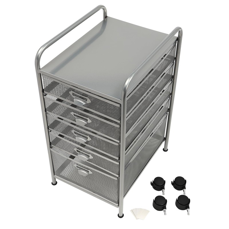 Utility Cart Organizer with 5 Drawers, Freestanding Rolling File Cabinet with Wheels (2 with brakes), Carbon Steel File Storage Organizer Slim Storage for Kitchen Utilities, 95% Pre-assembled (Silver)