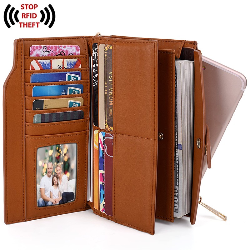 UTO Wallet for Women RFID Blocking Ladies Wristlet Purse 21 Card Slots Phone Pocket Synthetic Leather Brown