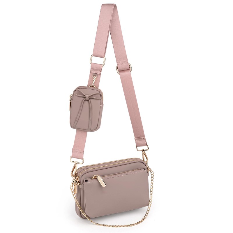 UTO Women's 3-in-1 Crossbody Bag, Wide Strap with Coin Bag, Handbag with Removable Chain, Shoulder Bag with Removable Adjustable Shoulder Strap, Small Bag, Leather, Stylish, 1296 Pink, Deconstructed