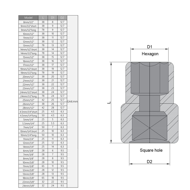 - 【Dimension】- 1/4-inch drive, 4.5mm / 0.18-inch 6-point socket, 25mm / 0.98-inch total long. 6-point socket opening provides an ideal, exact fit for hex-shaped fastener heads.