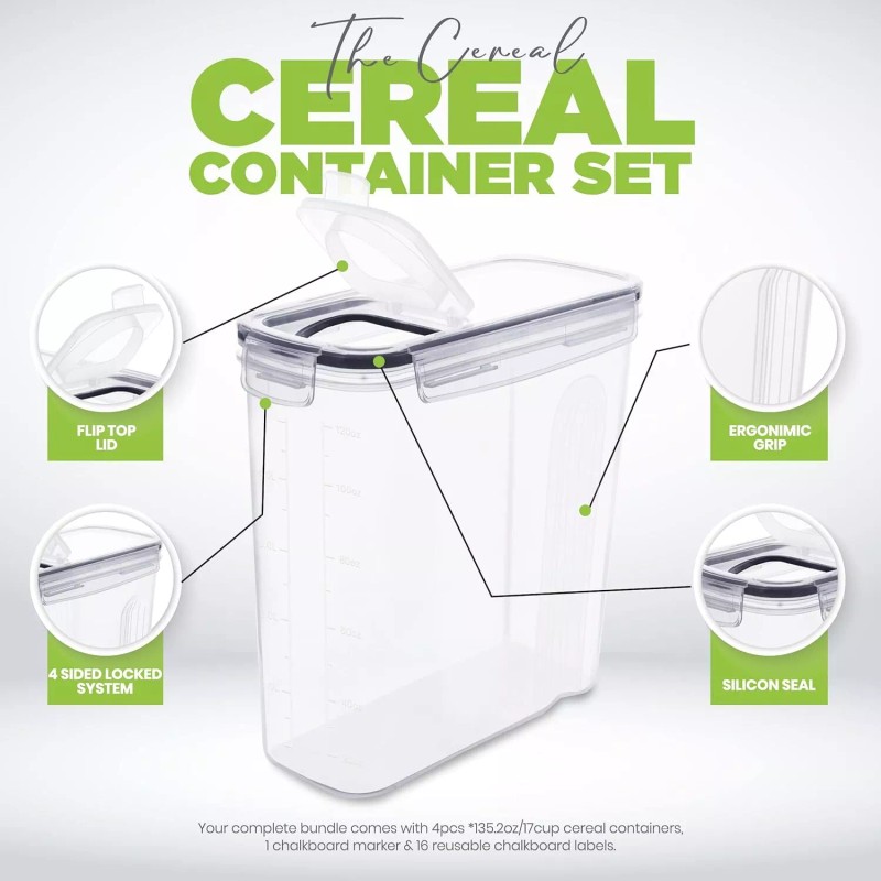 • Ideal For Storage - Each of the airtight food storage containers accommodates an airtight leakproof lid preventing any accidental spills and preserving freshness for a long. The cereal storage accessory also has a pouring spout on the lid for better convenience.