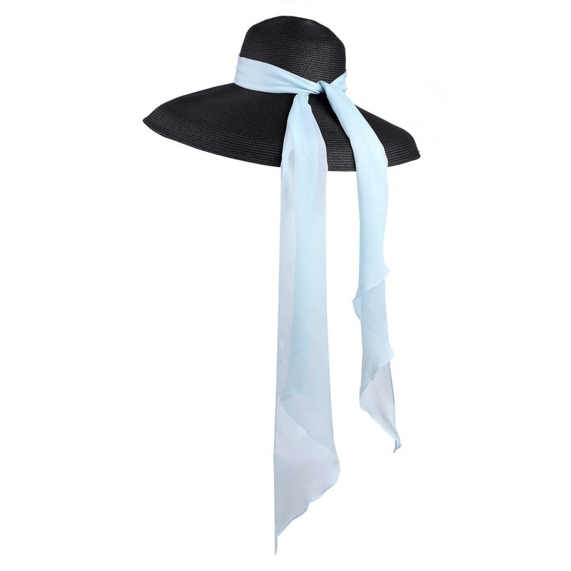 Utopiat | MIU Oversized Straw Holiday | Black Straw Hat with 100% Silk Scarf (Lucid Aqua) |Inspired by BAT's | Audrey Style