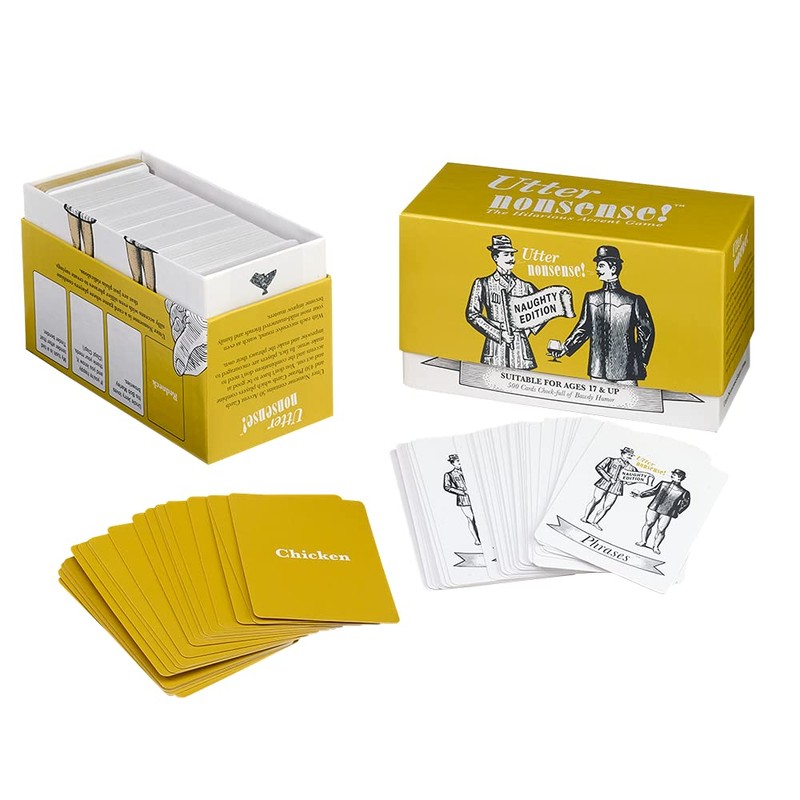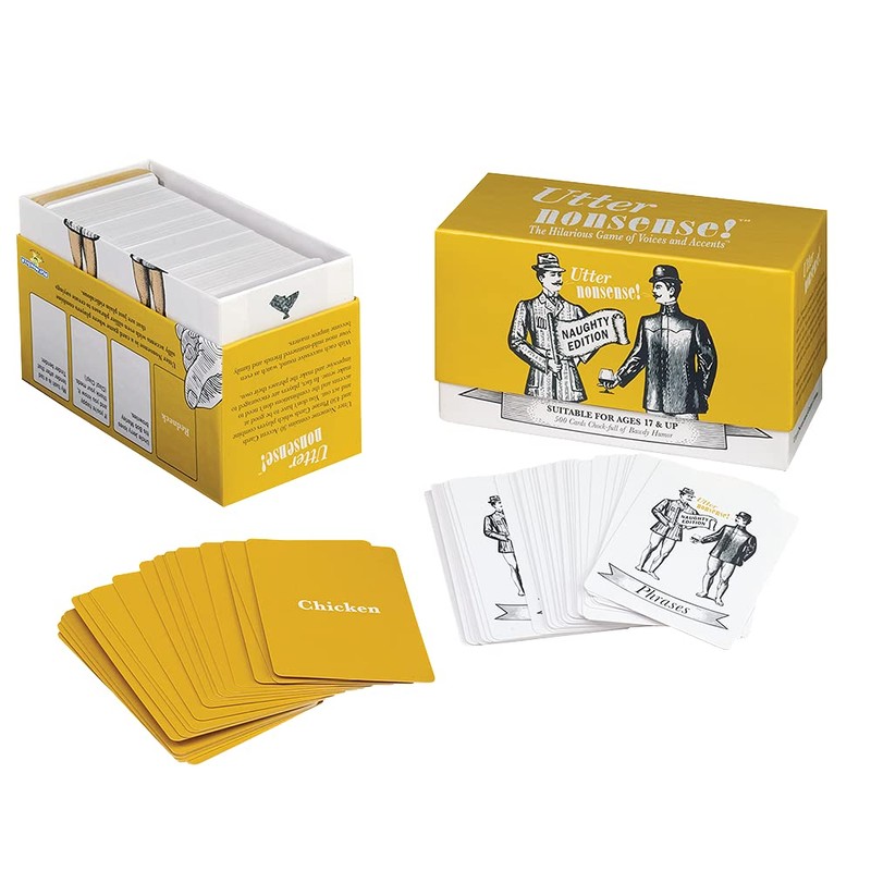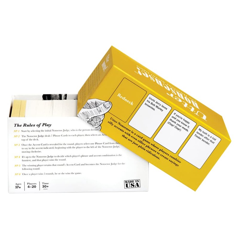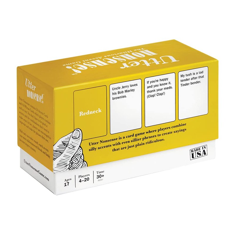 Players combine silly, crazy or edgy accents with funny phrases to create sayings that are just plain ridiculous! Each round features one accent, and each player must read one of their Phrase Cards in said accent. The Nonsense Judge picks their favorite to win that round! You don’t have to be good at accents to play—have fun with it and be silly to make the phrases your own! It’s a fun, laugh-out-loud game for the whole family! For 4 to 20 players, ages 17+.