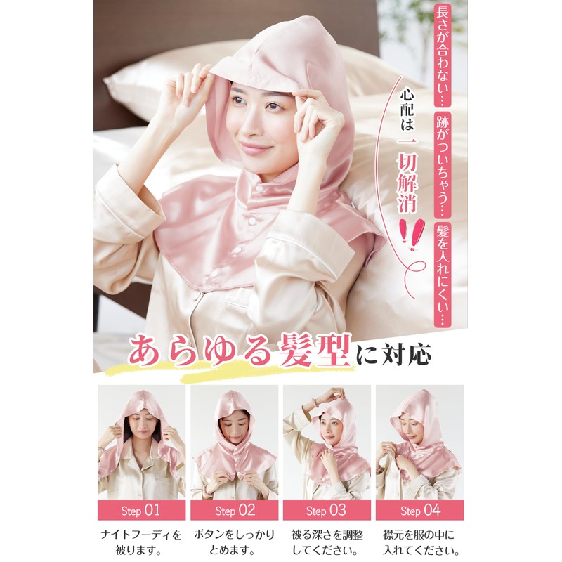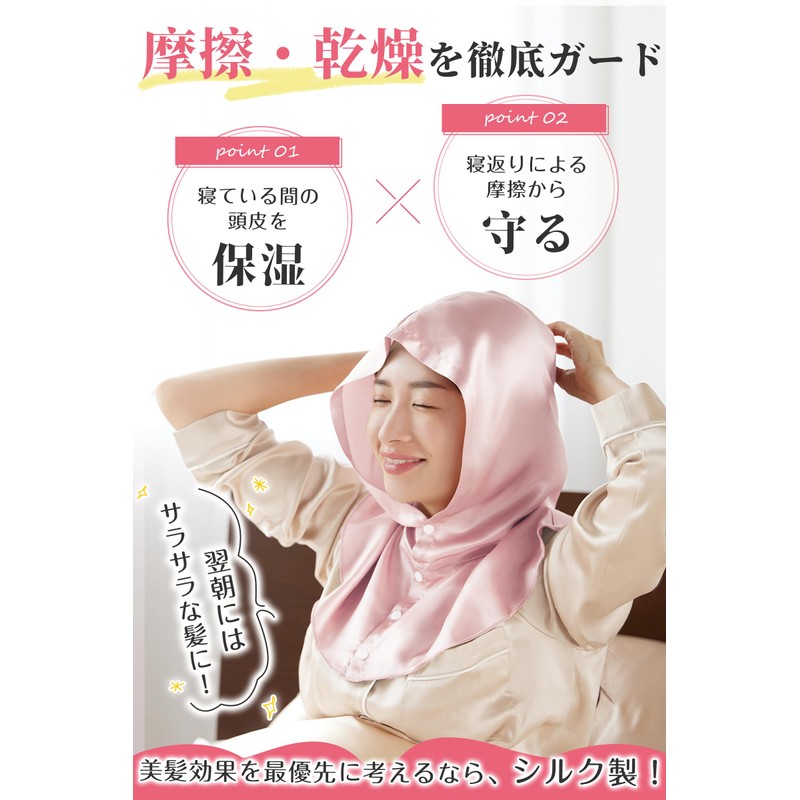 - Gentle on Skin & Protection Against Dryness: The silk night cap not only cares for your hair but also features a collar design that provides "warmth and moisture."The collar gently hugs your neck, protecting it from cold and dryness.Even if you sweat while sleeping, it remains breathable and hygienic, ensuring comfort throughout the night and upon waking.Silk is said to be a cure-all for your skin, keeping it moisturized while you sleep, and it also helps prevent stains and wrinkles.Not only does it enhance beauty, but it also supports a comfortable and restorative sleep.