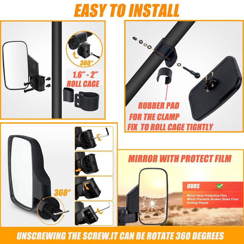 - Made of high quality plastic shell, glass lens and durable ABS clamps, the whole set of mirrors is wear and corrosion resistant, great for all weather conditions