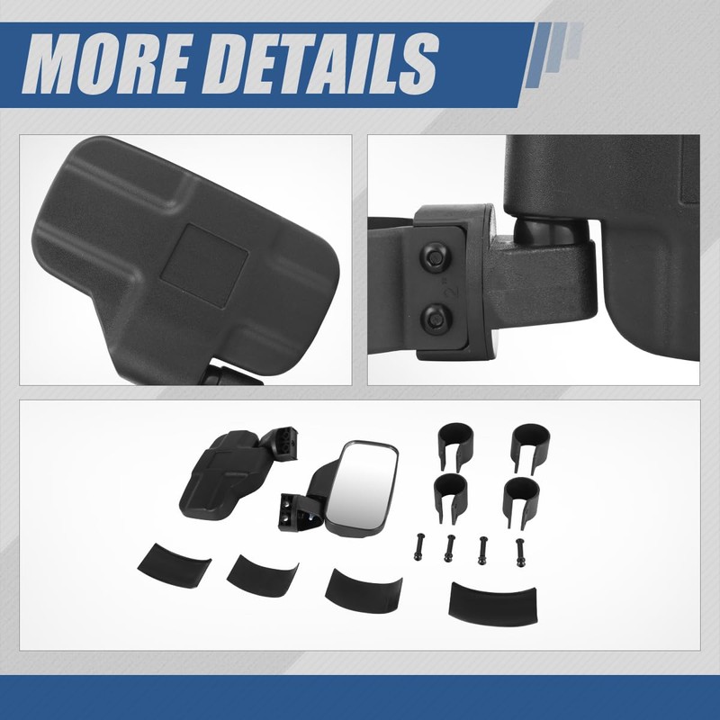 - Easy Installation - This Pair of UTV Rear View Side Mirror comes with all hardware included(1.5" Bracket X1, 1.75" Bracket X1, 2" Bracket X1) for a hassle-free setup, replacing factory mirrors effortlessly without modification.