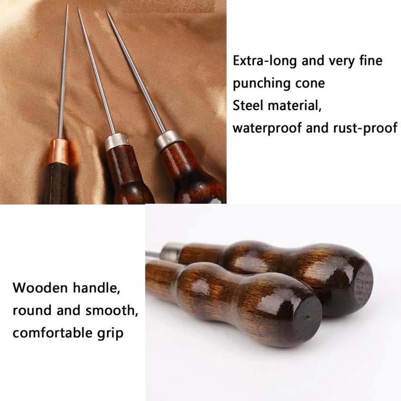 UtySty 3 Pack Scratch Awl Tool with Wooden Handle Gourd Shape Pin Punching for Leather Punch Hole Craft Repair Shoes Sewing Crochet DIY Handmade Stitch