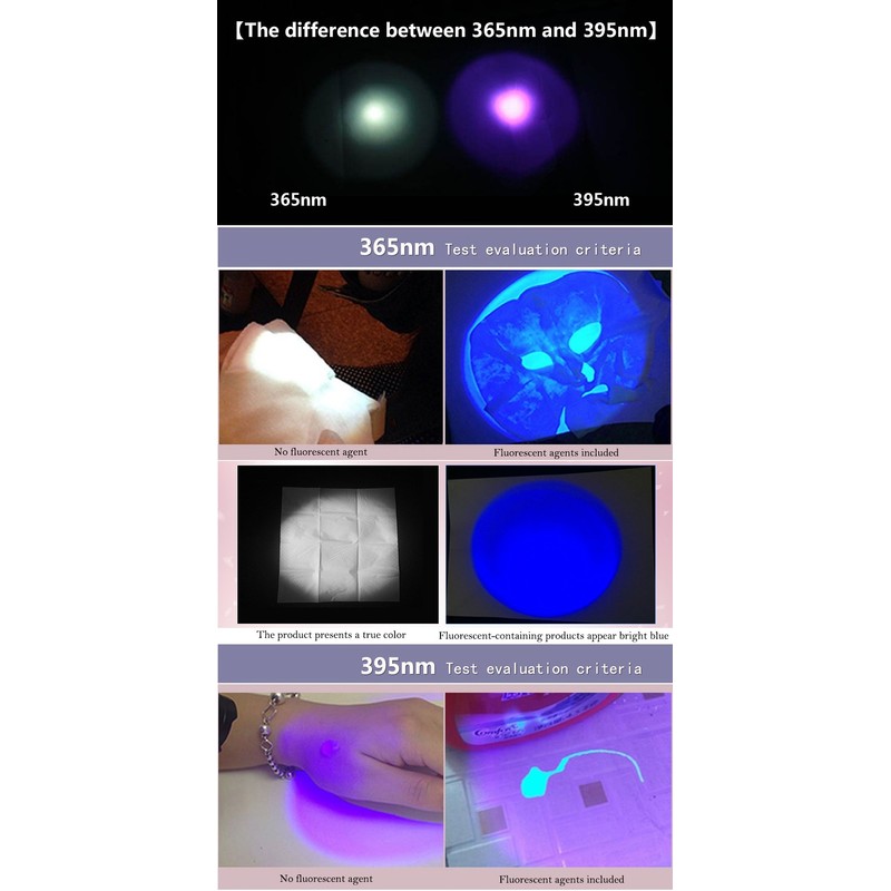 - 【365NM INVISIBLE ULTRAVIOLET LIGHT】--365nm ultraviolet light is invisible to the naked eye, so that it is not as BRIGHT as the 395nm flashlight, but more perfect for detection of high demand like fluorescent agents & security code. 365nm UV is the real dedicated detection spectrum. It can be used in natural light and performs better in the dark with little visible light leak.