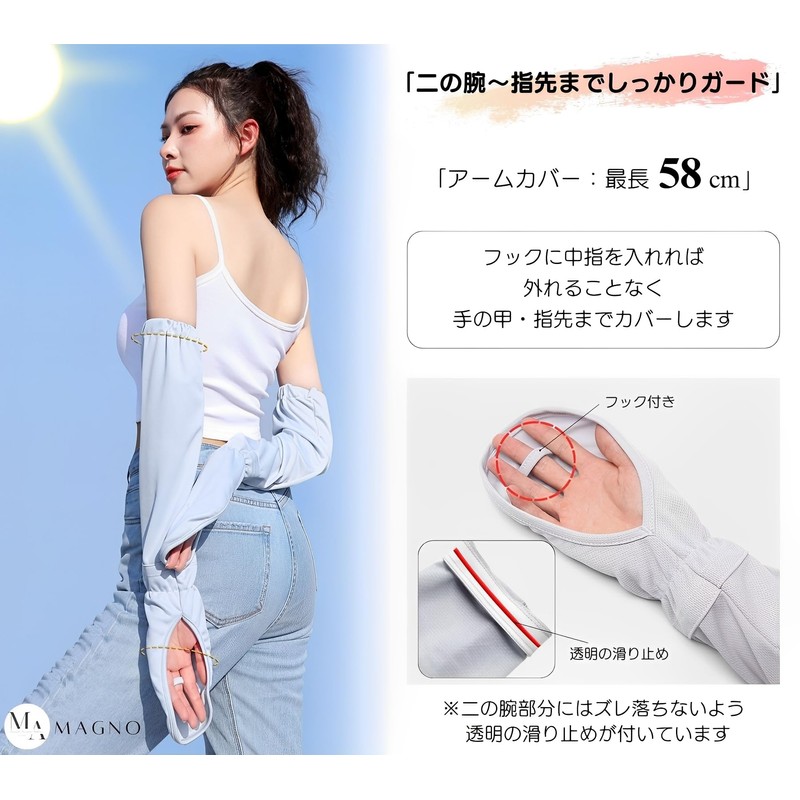 - 「二の腕から指先まであるロング丈」目の細かいメッシュ素材で、二の腕部分にはズレ落ちないよう透明の滑り止め付き。