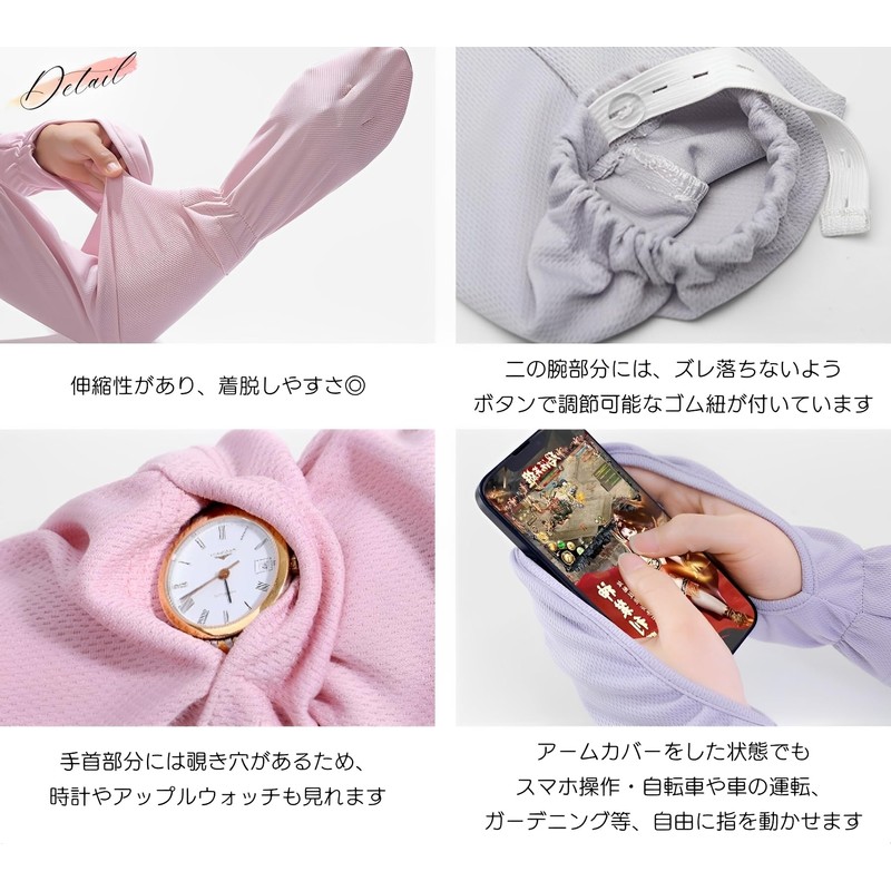 - 「細部までこだわったデザイン」アームカバーをした状態でもスマホ操作・自転車や車の運転・ガーデニング等、自由に指を動かせます。