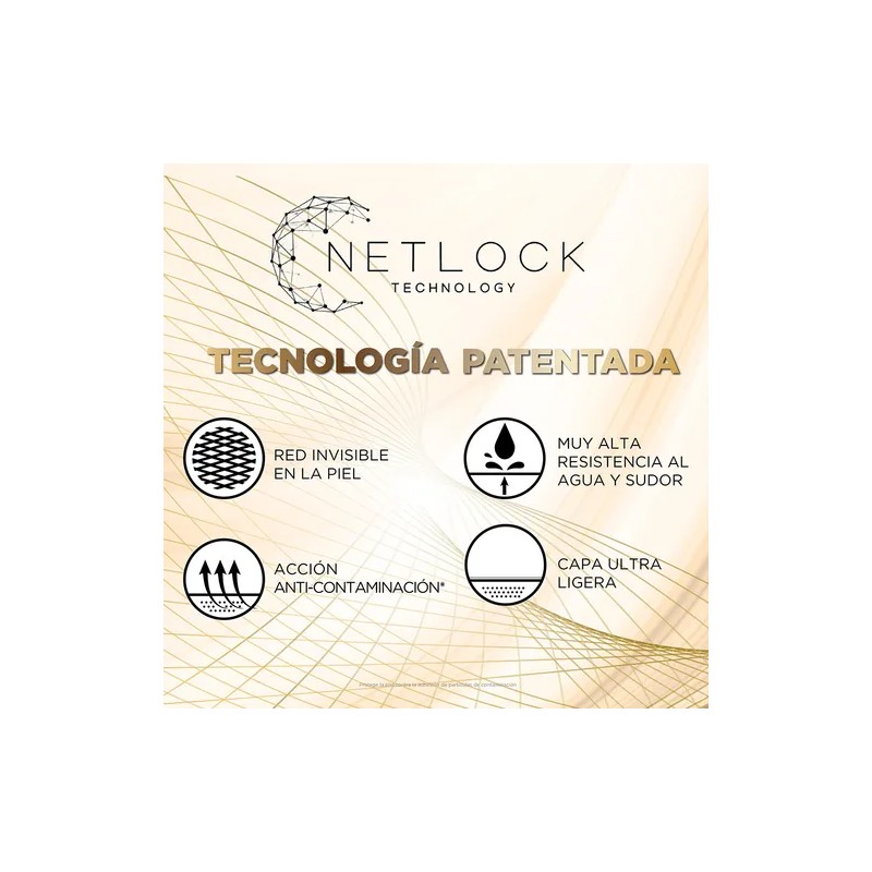 Textura fluida y ultra ligera con ácido hialurónico y tecnología patentada Netlock, que deja una red protectora invisible sobre la piel, con muy alta resistencia al sol, agua, sudor y contaminación para una alta protección de larga duración.