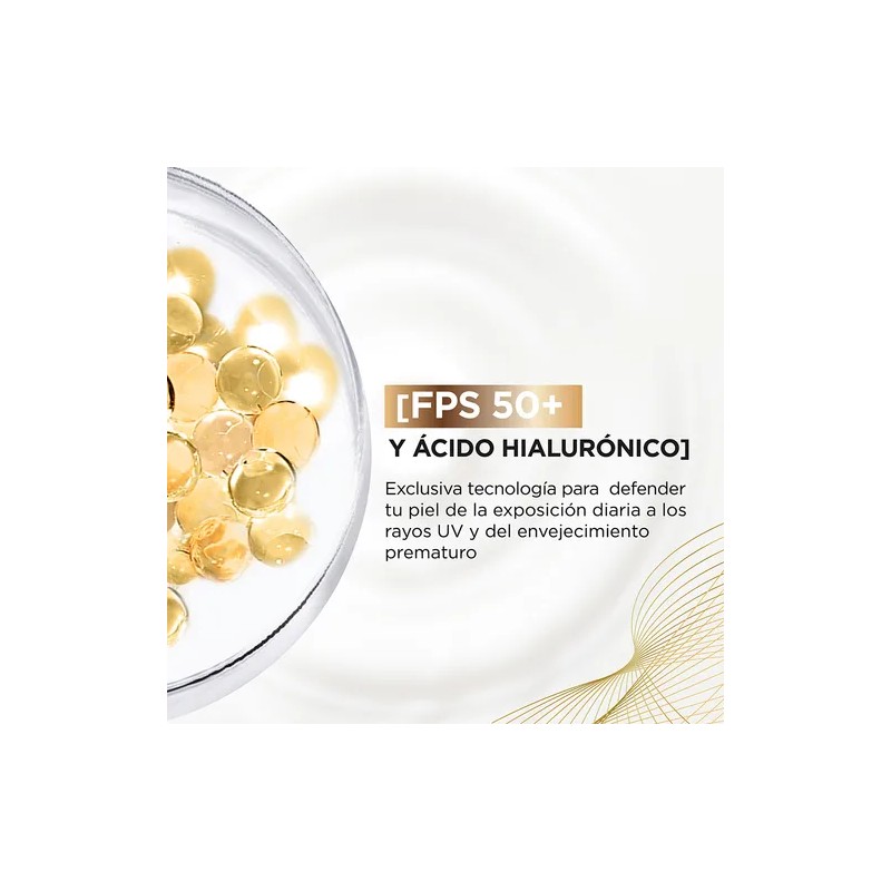 Protector solar de uso diario con color en tono medio, con FPS50+ y Ácido Hialurónico. Te brinda la más alta protección solar, con textura 11x más ligera y resistente al sol, agua y contaminación para prevenir los signos de la edad.